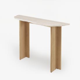 En référence à la mythologie grecque, Rhéa est la personnification des forces naturelles, déesse de la terre et des animaux, on la représentait vivant au fond des bois, sur les montagnes. Rhéa dessine une poétique inspirée du végétal, de la nature. Elle allie deux matériaux : le piétement en bois massif et le plateau en travertin. La structure des pieds est conçue en chêne avec un vernis naturel. Le plateau est en travertin à pores ouverts, avec 2 couches d’imperméabilisant, le chant du plateau reste brut (non poli). Le plateau en travertin (roche calcaire) présente de petites cavités, il permet d’avoir une texture au touché, un coté grainé et irrégulier. Sa couleur reflète la lumière. Le travertin est récupéré et retaillé pour offrir la forme d’une feuille. Il est recouvert de 2 couches d’imperméabilisant, chant brut (non poli), vérins réglables. La structure est équipée d’un système d’accroche pour fixer la console au mur. Le marbre (ou Travertin) est particulièrement sensible aux acides (vinaigre, citron), aux liquides qui en contiennent (vin, jus de fruit, colas) et aux liquides colorés (café, tomate, betterave rouge). Nous appliquons un traitement qui retarde la pénétration, mais la règle est d’essuyer immédiatement les tâches sans attendre. Il suffit de laver à l’eau tiède diluée avec un détergent doux, ne contenant pas de particules abrasives. Le traitement doit être renouveler régulièrement, un fois par an minimum.