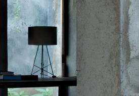 Lampe de table à lumière diffuse. Le support de l'appareil est en tube d'acier de 10mm de diamètre, soudé, brossé et chromé. Disque support de diffuseur en alliage de zamac moulé sous pression, poli et chromé. Couverture douille en PA6 (Nylon) moulé par injection, de couleur blanche. Diffuseur interne en PC (polycarbonate) moulé par injection à 3%, de couleur opaline. Embouts de pieds en PVC élastique (chlorure de polyvinyle) moulé par injection, transparent. Le diffuseur externe est en plaque d'aluminium tourné peint en blanc mat à l'intérieur. Coloris extérieur : blanc ou noir brillant. Le diffuseur est en verre gris chemisé, soufflé à la bouche, finition externe brillante. Sur le câble il y a le dimmer électronique qui permet de régler pas à pas l'intensité lumineuse.