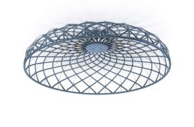 Appareil suspendu à éclairage diffus. Le dôme est une combinaison d'éléments lumineux et sombres disposés en réseau et formés de structures centrales recouvertes d'un mince maillage tubulaire coloré entrelacé fabriqué à partir de tissu recyclé et recyclable produit à partir de polyester. Chaque élément lumineux est alimenté par des micro-connecteurs spéciaux situés dans la partie supérieure de la coupole et est recouvert d'un maillage bicolore, tandis que la face tournée vers l'intérieur de la coupole est toujours blanche afin de permettre une émission lumineuse optimale depuis le Module LED. L'appareil est équipé d'un système d'équilibrage intégré au sommet du dôme qui permet d'ajuster son équilibre, le rendant ainsi parfaitement stable. Le bas du dôme est complété par un anneau en aluminium qui maintient toute la structure du réseau des dômes en place grâce à un simple système d'encliquetage. Le produit est assemblé sans colle, il peut donc être entièrement séparé pour être recyclé ultérieurement et en cas de réparation ou de remplacement. Finitions de lampe disponibles : Bleu Tourmaline, Amande, Anthracite ou Rouge Brique. Equipé d'une électronique intégrée qui permet l'utilisation de différents systèmes de variateur : 0-10V / 1-10V / DALI / PUSH."