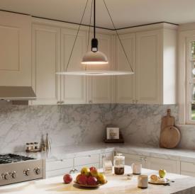 Suspension à lumière directe, diffuse et réfléchie. Diffuseur plat en polymethyl méthacrylate (PMMA) opalin, moulé par injection, suspendu au corps de l'appareil par trois fils en acier harmonique. Réflecteur en tôle moulée, polie, nickelée, recouverte d'une laque de protection et entièrement laqué coloris blanc.