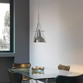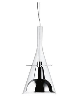 Suspension à éclairage direct et modulable. Diffuseur en verre borosilicate transparent. Réflecteur en aluminium chromé brillant. Support de réflecteur en métal chromé. Câble d'alimentation transparent. Rosace de plafond en thermoplastique chromé. Ampoule non fournie.