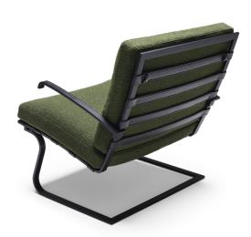 Ce fauteuil lounge sophistiqué allie confort et polyvalence grâce à son piètement en porte-à-faux, son dossier en cuir et sa forme épurée. Deux coussins non capitonnés et des accoudoirs en option complètent sa structure agréablement cinétique. Il est proposé en deux finitions et un large choix de revêtements.