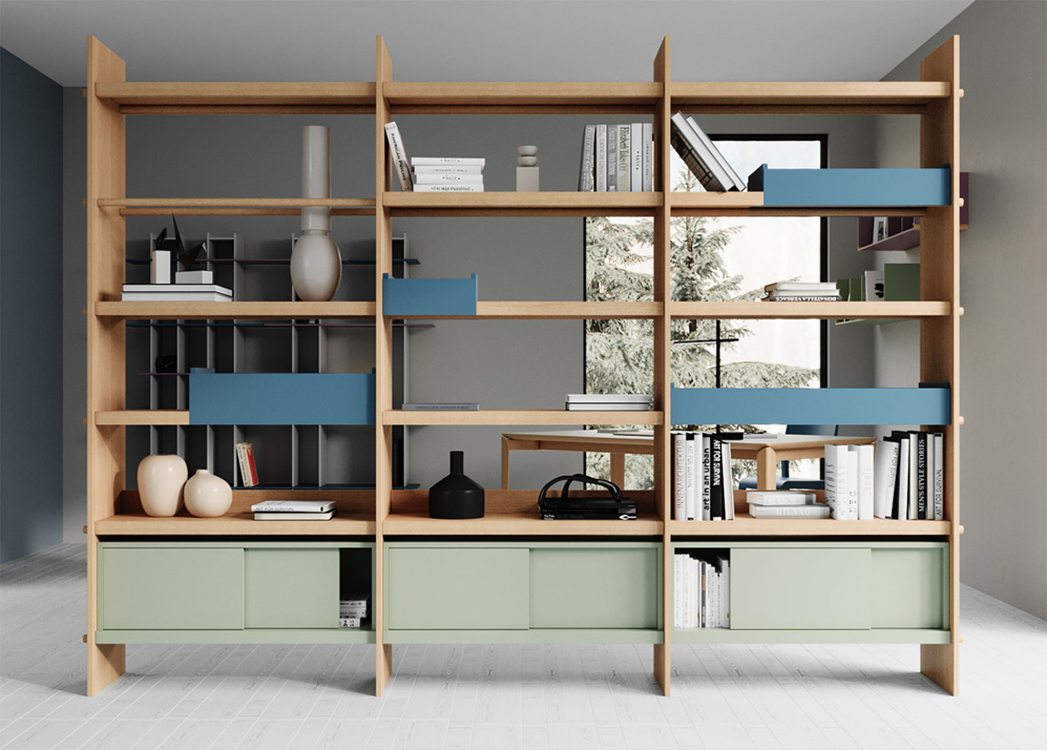 Comme l’ancien instrument de calcul dont elle tire son nom, Abaco (abaque en français) peut se comporter de différentes manières, grâce à des modules de joues et d’étagères, ainsi qu’à la possibilité d’ajouter des caissons ouverts et coulissants dans lesquels ranger livres et objets.
