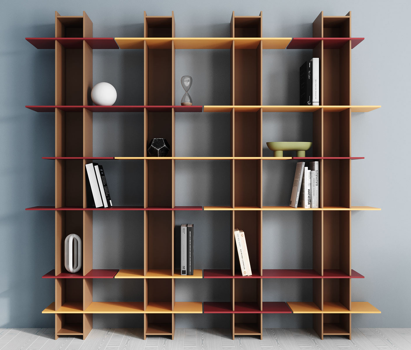 La caractéristique principale de cette bibliothèque est la légèreté de sa composition, avec un jeu d’encastrements simples. Une fois remplie, la structure, solide dans sa construction, “disparaît” et la paroi apparait alors sillonnée de lignes horizontales et verticales qui la parcourent.