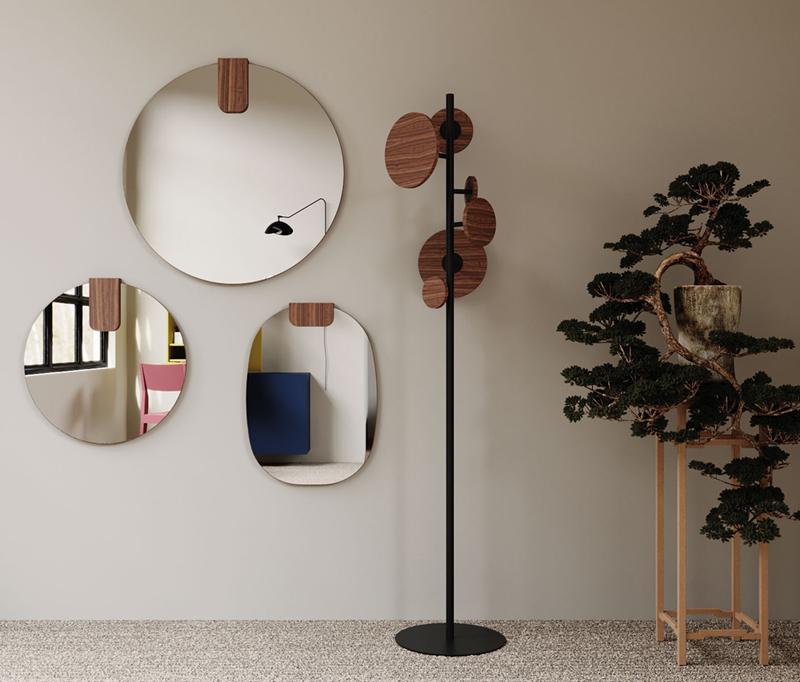 Famille de miroirs muraux disponibles en deux formes (ronde et ovale) et six dimensions. Ils se caractérisent par un élément d’accroche en Placage (bois) V16 chêne, V18 chêne teinté anthracite, V19 noyer américain ou Touch (laqué). Le verre du miroir est disponible en deux couleurs: talpa et grigio.