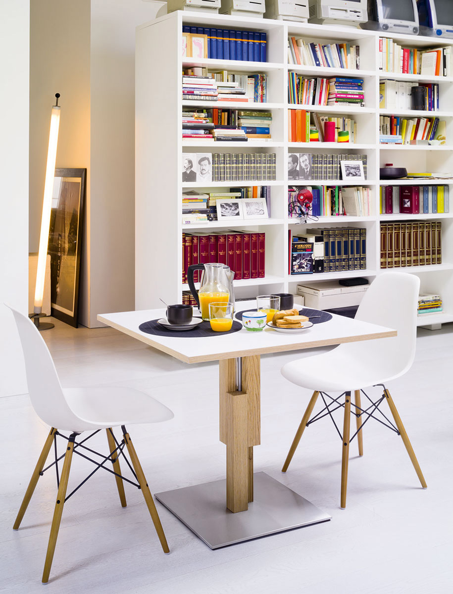Faciles, rapides, multifonctionnelles, les tables Duetto et Bistro créent un lieu selon la fonction, répondant aux exigences de ceux qui ont des espaces réduits. La première se transforme en table basse de salon, la deuxième, en une table haute de bar/snack.