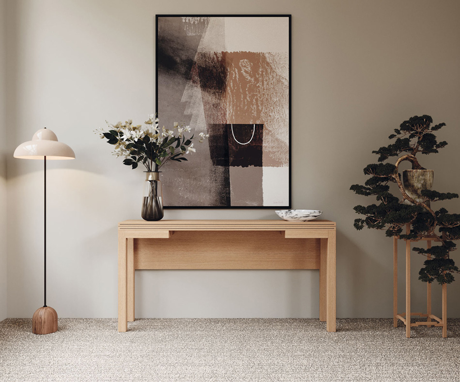 Console avec structure en bois massif, transformable en table de repas ou de réunion en déplaçant simplement les pieds et le plateau. Le plateau pliable (en trois parties) est en Placage (bois) sur les deux faces.