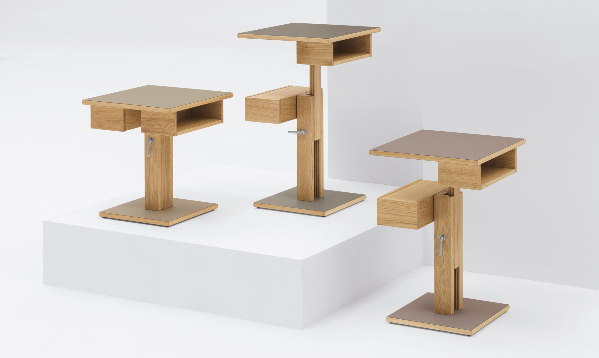 Table de nuit ou table d’appoint, structure en Bois massif et possibilité de régler le pied en hauteur. Le tiroir est en Placage (bois). Le plateau et la base sont en finition laminé, Exclusive (Polaris) ou Placage (bois) avec le chant dans les mêmes finitions en bois massif que le pied/structure. Ce petit meuble peut être installé aussi bien comme table de chevet dans la zone nuit, que comme table d’appoint dans le séjour. De série, le tiroir est toujours à gauche.