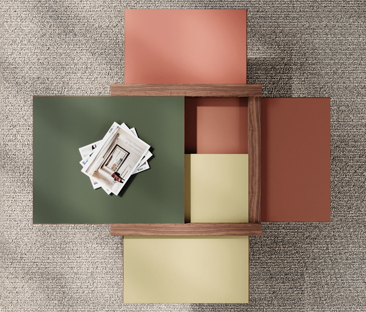 La table basse Par4 se transforme dans la forme et dans les fonctions en un jeu esthétique qui change la distribution de l’espace.